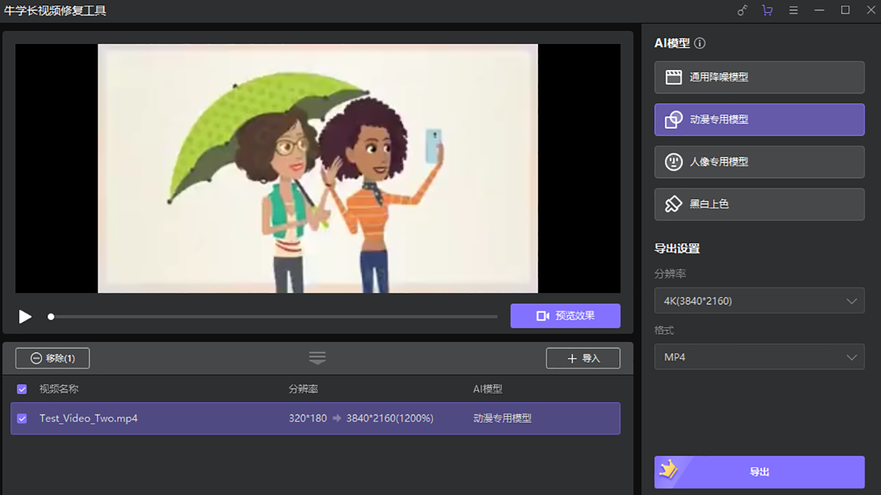 牛学长视频修复工具之中用户可以直接使用该软件进行视频画质增强,该软件可以快速对视频内容进行画质升级,在软件使用的时候,针对视频类型对于人物进行加强,还能对音质进行降噪。