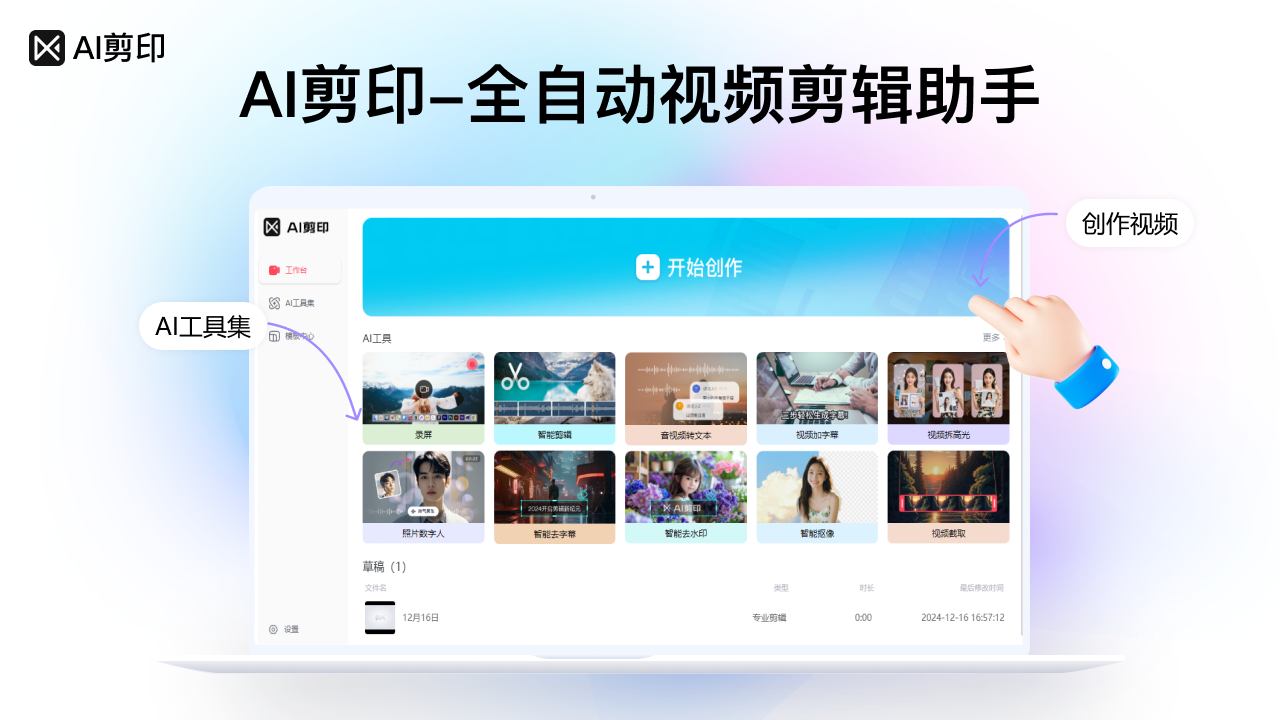 内置智能素材推荐、自动剪辑、特效生成等 AI 工具,精准匹配主题需求,解决素材与剪辑难题。