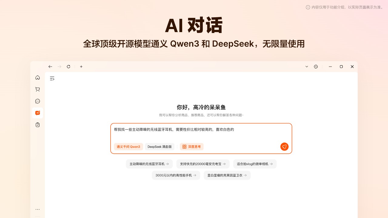 淘宝桌面版有着非常强大的购物功能,不仅如此作为一款桌面软件,该软件还配置着强大的开源模型通义Qwen3和DeepSeek,可供用户无限使用,支持对话查询能力,可以在购物的时候轻松解决心中疑虑,面对最新商品成分也不茫然。
