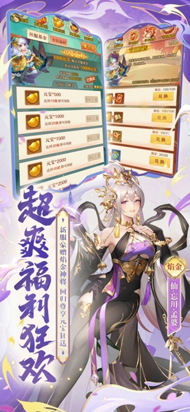 新服登录累送 100000 元宝,首周超级神将孙悟空、二郎神、牛魔王任你选,7 日送最强法宝,终身免费送元宝、神将、VIP 经验等,还有实物大奖、现金大奖、定制周边等,平民玩家也能畅爽游戏。