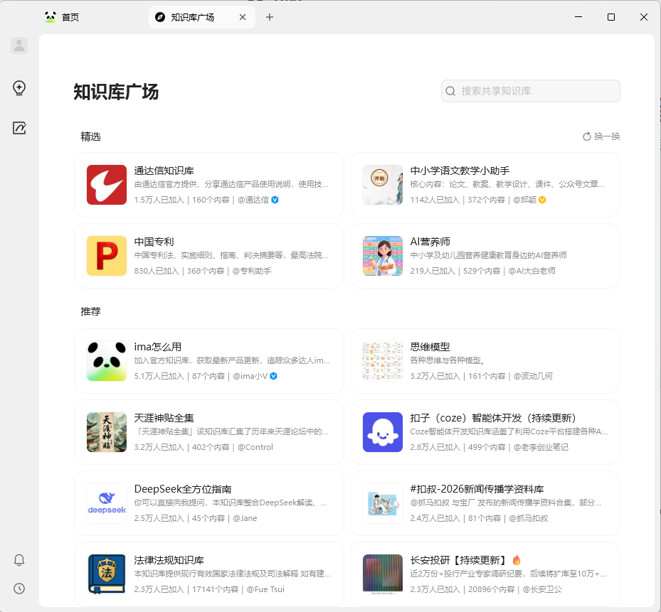 ima电脑版是一款面向学习和办公场景的人工智能工作台,ima PC最新版支持导入和解读知识库文件及本地文件,用户可以通过强大的知识管理工具,能够精准查找所需资料和信息,同时根据用户的使用习惯和需求,智能推荐相关内容,帮助用户发现更多有价值的资源,可以高效整理、搜索和文件信息。